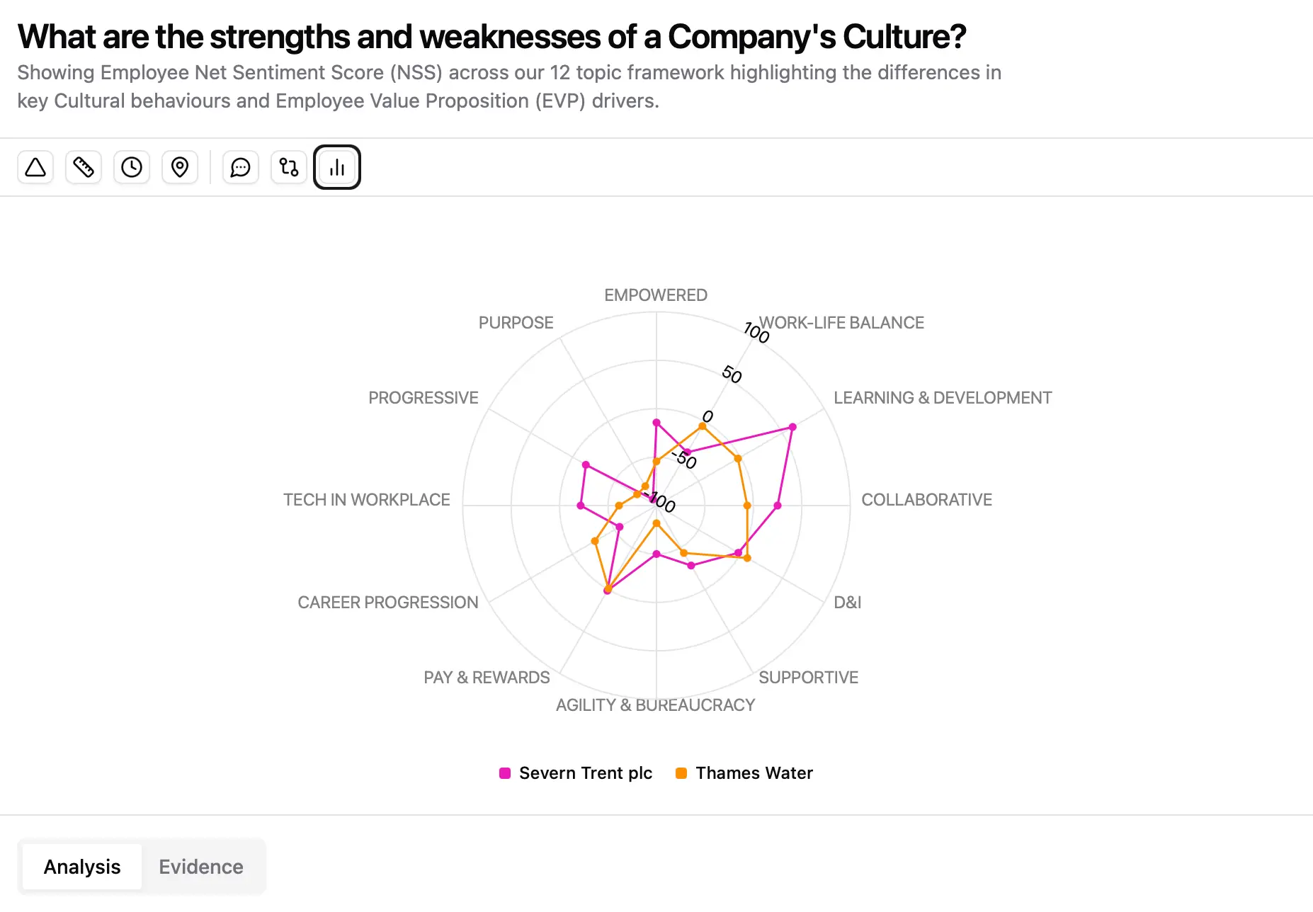 While Severn Trent also faces challenges—such as a -92.59% NSS in “Purpose” and -56.00% in “Career Progression”—its overall cultural health appears more positive compared to Thames Water.Notably, Severn Trent’s “Agility & Bureaucracy” score is -50.00%, significantly better than Thames Water’s -81.82%, suggesting a more adaptable organizational structure.
